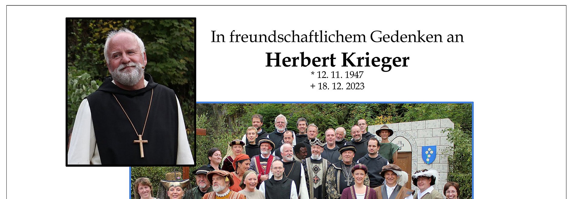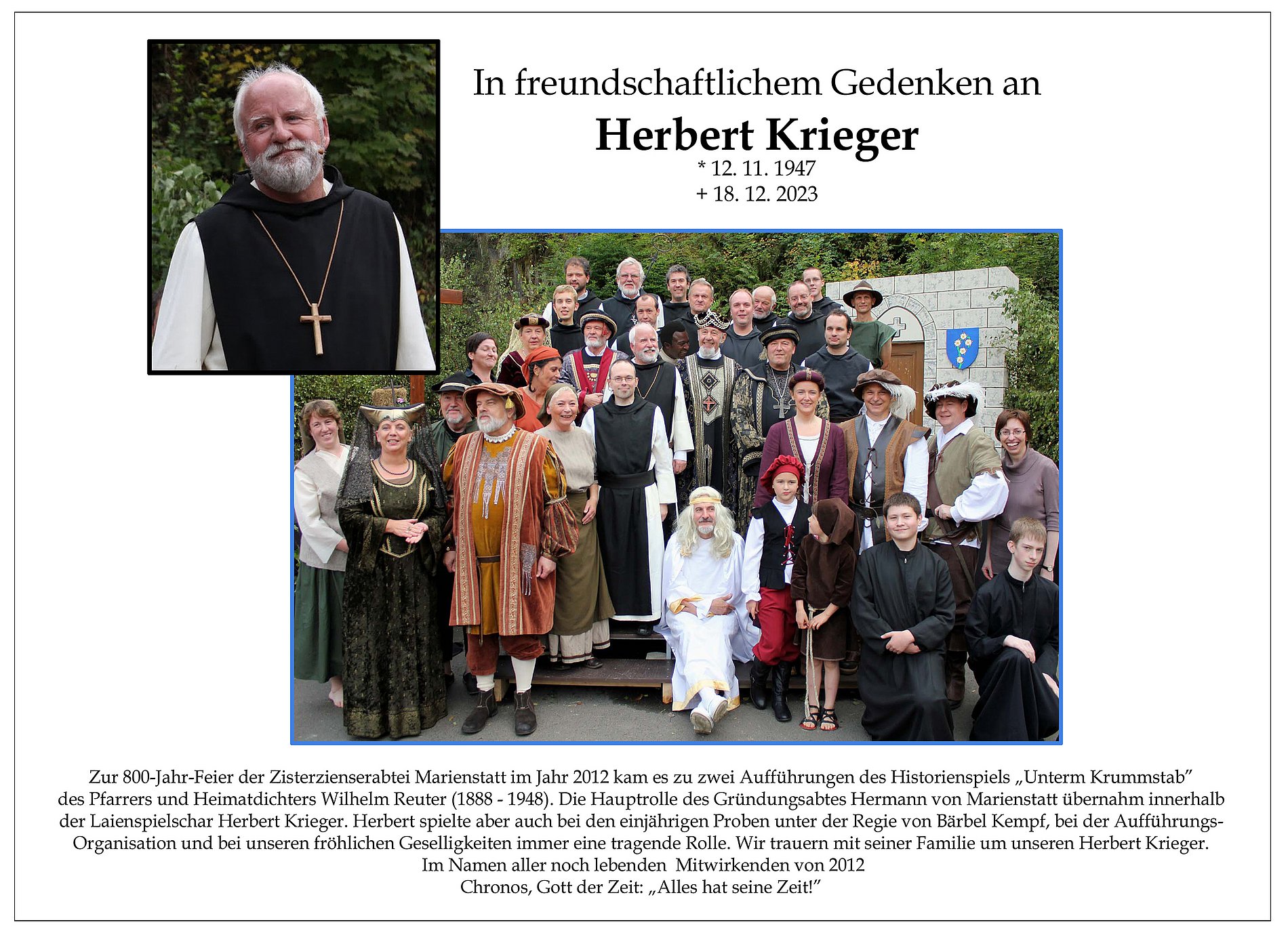 Seine besonder Nähe und Liebe zur Zisterzienserabtei Marienstatt drückte sich u.a. darin aus, das er, wenn nötig, vertretungsweise als „Bruder Pförtner" den Dienst an der Klosterpforte übernahm und sogar als „Vater Abt" kam er zum Einsatz. Als die Abtei im Jahre 2012 ihr 800-jähriges Bestehen feierte, wurde das Historienspiel „Unterm Krummstab", über die Gründung des Klosters aufgeführt. Herbert Krieger übernahm darin die Hauptrolle des Gründungsabtes Hermann von Marienstatt. Er spielte die Rolle so gut, dass er auch als „richtiger" Abt hätte durchgehen können...